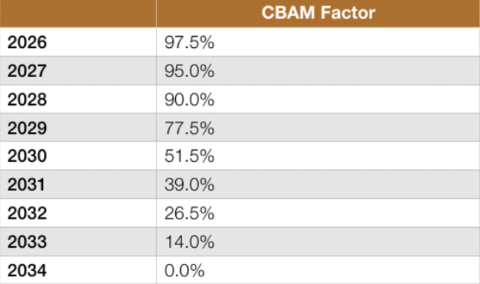From 2026 to 2034 the EU gradually removes free allowances using the CBAM factor. This factor starts at 97.5 per cent in 2026 and falls stepwise to zero in 2034, so each year a larger share of embedded emissions becomes chargeable.